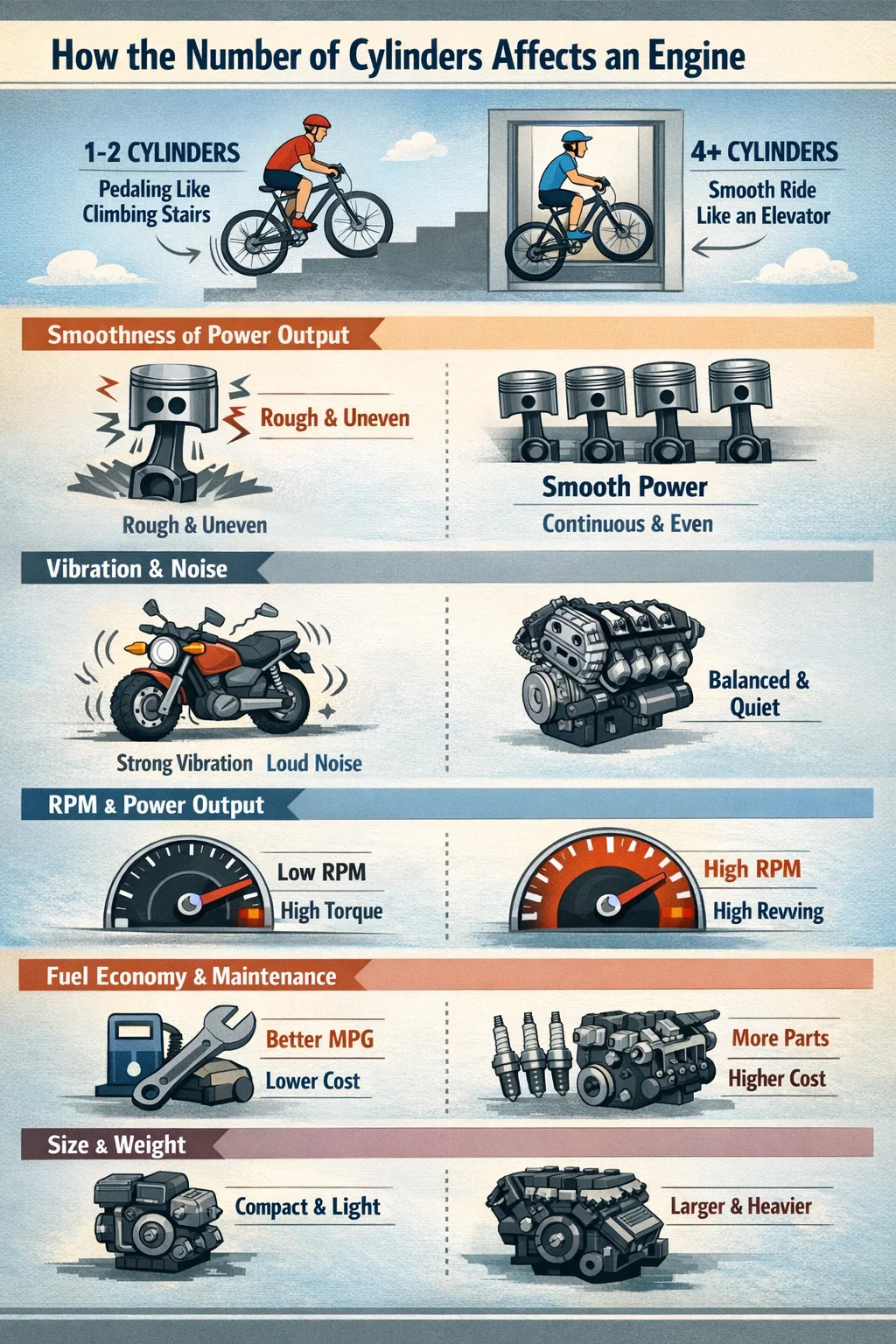 Faible nombre de cylindres (1-2 cylindres) : c'est comme monter des escaliers ; vous pouvez ressentir une « sensation de pédalage » distincte. Ce type de moteur a une bonne puissance à bas régime, mais la puissance de sortie présente une sensation de pulsation notable et n’est pas très continue.