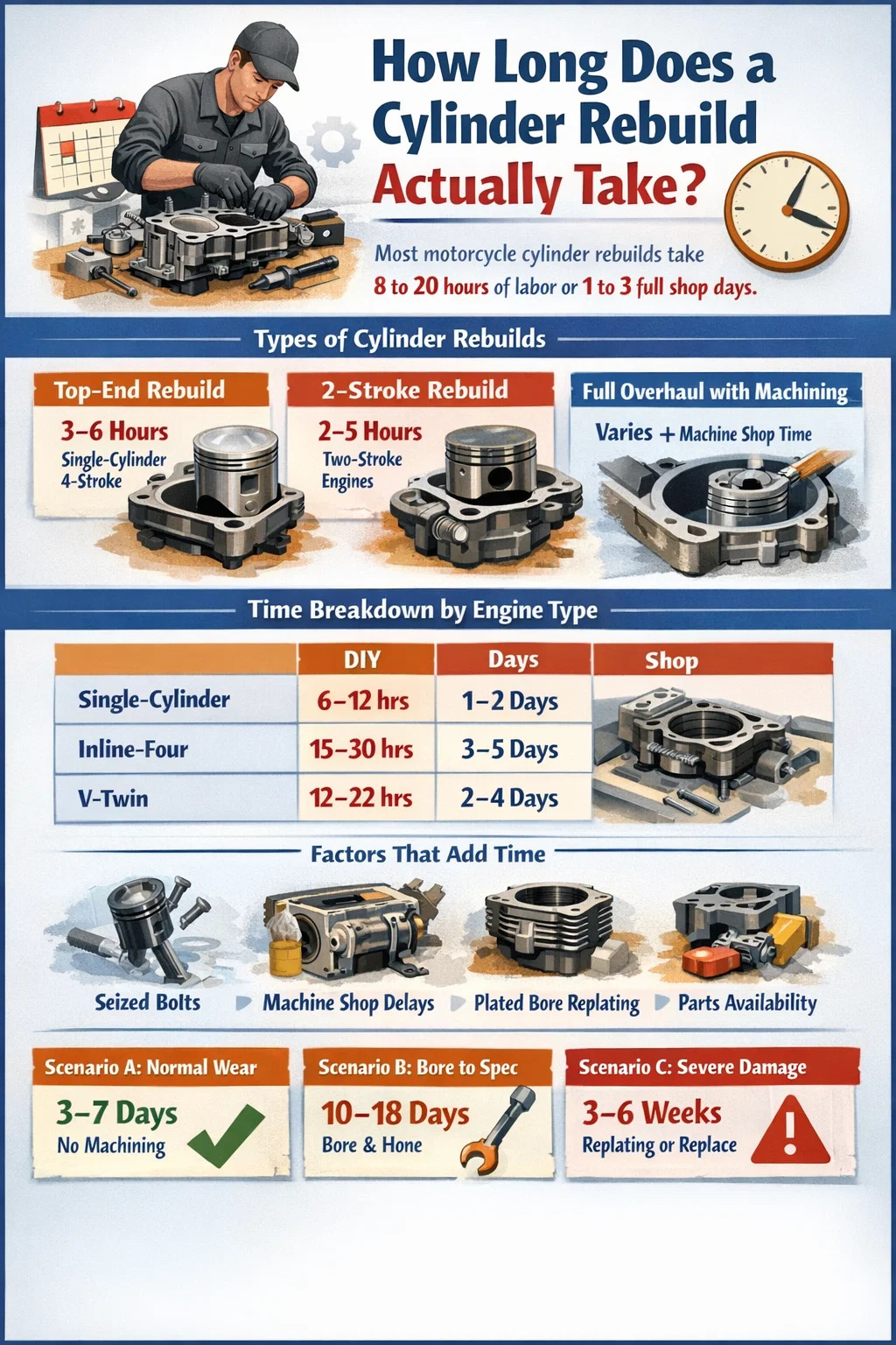 Pour la plupart cylindre de moto reconstructions, vous devez planifier 8 à 20 heures de travail si vous faites les travaux vous-même, ou grosso modo 1 à 3 journées complètes de magasin si le travail est confié à un mécanicien professionnel. Cette plage est volontairement large : le temps réel dépend fortement du type de moteur, de l'état du cylindre, de la nécessité ou non d'un travail en atelier et de la disponibilité des pièces.