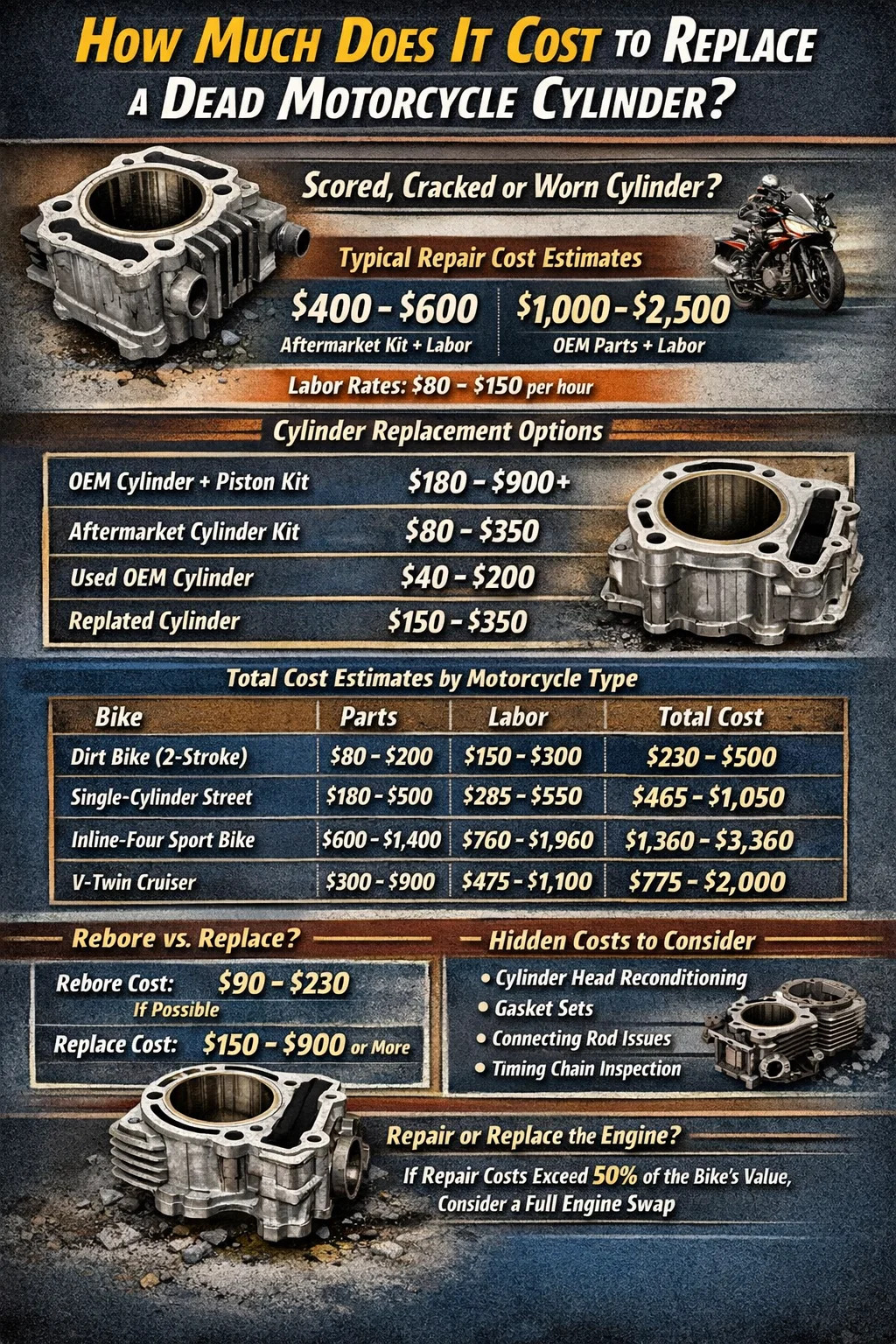 Si le cylindre de votre moto est grippé, fissuré ou usé au-delà des spécifications, vous avez affaire à une facture de réparation qui varie généralement de 300 $ à 1 500 $ ou plus , en fonction du type de moteur, du coût du cylindre ou du kit de cylindre de remplacement et du tarif de la main d'œuvre de votre atelier. Sur un petit vélo de banlieue monocylindre, un kit de cylindre de rechange économique peut coûter aussi peu que 80 $ à 150 $ pour les pièces seules. Sur une moto de sport bicylindre ou quatre cylindres de grande cylindrée, les composants du cylindre OEM peuvent dépasser 600 $ à 900 $ avant qu'un mécanicien ne prenne une clé. Ajoutez à cela de la main d’œuvre – qui coûte généralement entre 80 et 150 dollars de l’heure – et un travail qui prend quatre à huit heures, et les coûts totaux grimpent rapidement.