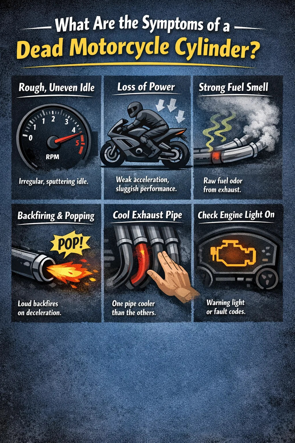La réponse la plus directe : si votre moto tourne mal, a une puissance sensiblement réduite, sent le carburant non brûlé ou a des ratés d'allumage au ralenti et sous charge, il y a de fortes chances qu'un de vos cylindres ait cessé de fonctionner. Cet article vous explique toutes les méthodes pour le confirmer, ses causes et comment le résoudre.