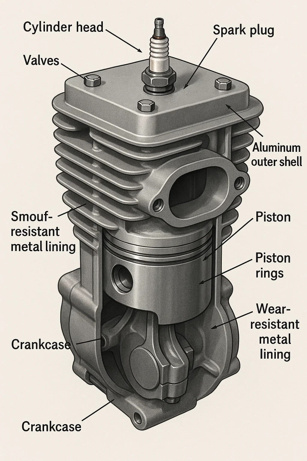 A généralement une coque extérieure en aluminium (dissipation thermique rapide et légère), avec une doublure métallique résistante à l'usure à l'intérieur (comme un revêtement nickel-silicium ou une doublure en fer) pour empêcher l'usure du piston.