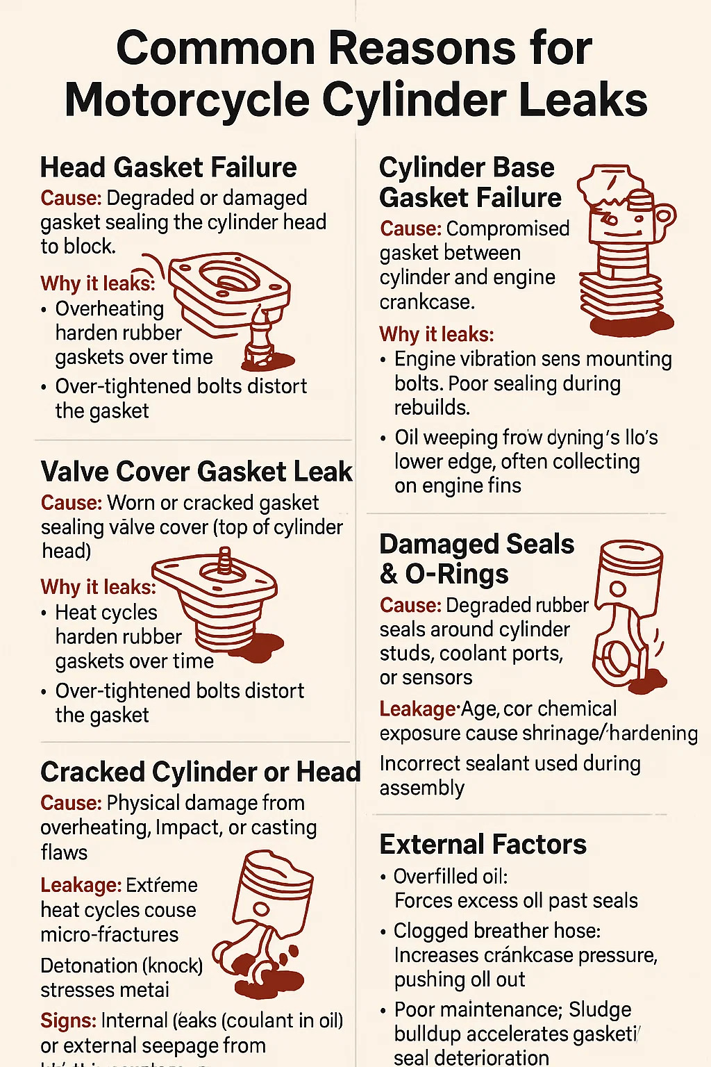 Signes : De l'huile s'écoule du bord inférieur du cylindre, s'accumulant souvent sur les ailettes du moteur.